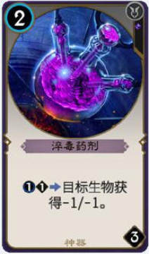 《秘境对决》里有一种卡牌是新类型的卡牌,叫做神器,神器不属于法术也不属于生物,可以辅助也可以当去除,神器有主动的,需要玩家选择目标对象;也有被动的,不需要主动使用也能发挥效果。一般来说,能够主动使用的神器会有耐久度,如下面一张神器卡牌淬毒药剂,每使用一次需要消耗1费用和1点耐久度,效果是使选定的目标生物永久-1/-1。这张神器有3点耐久度,也就是说可以使用3次,耐久使用完到0后,神器会自动消失。