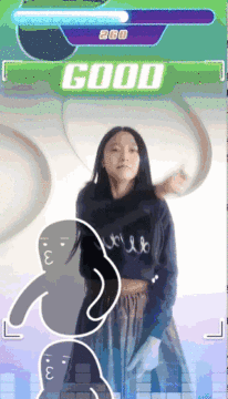 游戏界面如下,会有相应的舞蹈指示,AI会对动作进行评判并打分。只要你根据屏幕上的动作提示做出相应动作,系统就会根据动作契合程度出现比如“great”、“good”、“miss”等提示,完成录制后会得到相应的分数。