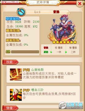曹操基础属性比普通七星武将多加%10+优势在于曹操的6个情缘都是武将,不需要神装凑情缘,武将比较容易配!!PVE副本技能天崩地裂能对敌人造成大面积的伤害附带减速效果!兵种是法师,单体攻击带减速效果,能给副本BOSS致命的打击。竞技场PVP技能是回血,没错就是跟别人在竞技场上pk还剩一点血,只要触发了回血技能就有机会转败为胜!