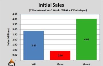 在这个销售数字统计时期,微软Kinect 400万套,任天堂的Wii销售290万套,新力的Move却仅有90万套的惨淡业绩。 ... (410万跟VGC颁布的90万.... 落差很大)。在体感三巨头的首次团体正面对决中,微软的Kinect无疑已经占据了上风。