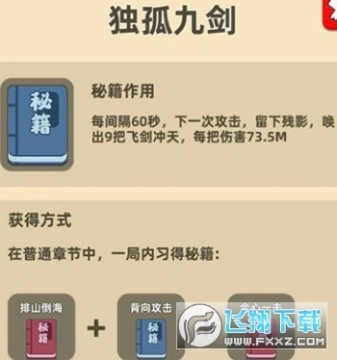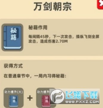 效果:每隔60秒攻击召唤一个帅气的武侠人物,并带有9把剑,飞向多个角度造成伤害。