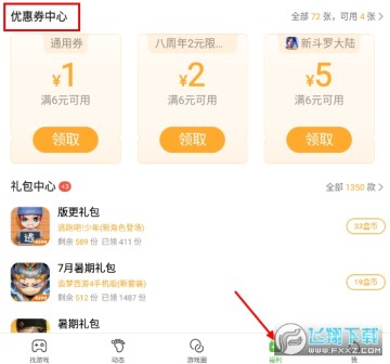 在最新版本的游戏盒中,【广场】新增了一个【优惠券中心】模块,大家在中心领取优惠券之后,就可以到游戏中去享受充值优惠~