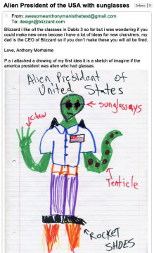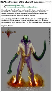 暴雪的回应:这位玩家,谢谢你给我们发来邮件。我们总是很期待收到来自暴雪公司其他同事的邮件。我爸是暴雪老板,所以如果你们不照做的话你们会被炒鱿鱼的。