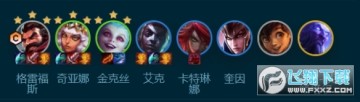 所需弈子:男枪、奇亚娜、金克丝、艾克、卡特、奎因、丁真、瑞兹。