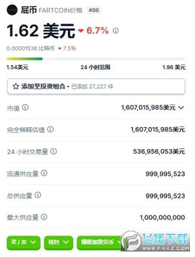 Fartcoin(放屁币)确实在AI主题的加密货币赛道中表现得异常突出,成为了一个令人瞩目的现象。截至2025年1月22日11时,Fartcoin的价格达到了1.62美元,在短短三个月内从历史最低点飙升超过7800%,市值攀升至16亿美元,并成功跻身动物类Meme币的TOP10行列。