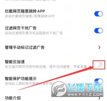 4、进入后,将“智能云加速”关闭,当然,其它的选项也可以根据你的需求进行关闭。