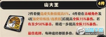 “山大王”四件套具备优秀的暴击率与攻击力加成,适配橘福福的暴击转化机制与主动技输出机制,是当前版本下的主流首选。