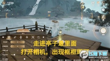 传送至【奇境画轴·丹青之境望龙亭】锚点 → 右转前往瀑布边拍摄。若无法触发金框,可左转跳到下方石块,调整相机距离至远景后拍摄。