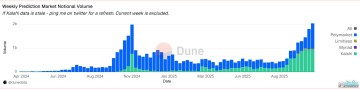 全球对预测市场的兴趣达到了新高度,10月中旬每周交易量首次超过200亿美元,根据Dune Analytics的Dunedata数据。