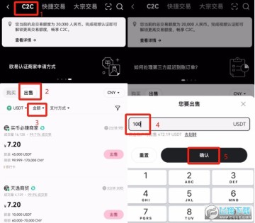 如果我们是普通的出金提现,直接就可以选择C2C的选项。选择【出售】,下方的金额这里我们可以筛选一下,比如说我想出售100个USDT,点击【确认】。