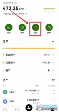 设置完成之后我们需要先返回到首页,来到【资产】里面,去看一下你的资产是在哪个账户里面。如果是在交易账户里面,就需要我们把交易账户里面的USDT划转到资金账户。因为交易账户是针对一些线上的加密货币的交易的,比如说现货、合约。而资金账户才是针对于出入金的账户。这个时候我们就可以点击【划转】。