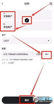 点击一下中间这里的双箭头,这样就可以把我们的USDT从交易账户划转到资金账户,数量选择最大,点击【确认】。