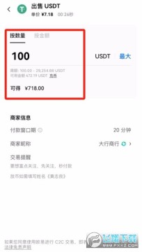 你可以选择按数量出售或者是按金额出售。按数量就是比如说我想出售100个USDT,商家就会忘我们的支付宝里面打718块钱。