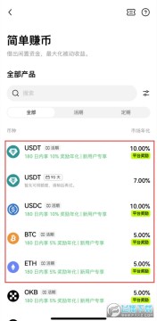 3、进入界面之后,我们可以看到欧易提供了很多加密货币的活期理财功能。比如说USDT、USDC、比特币、以太坊等。