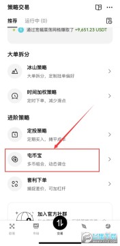 1、打开欧易APP的策略交易里面拉到下方,点击【屯币宝】。