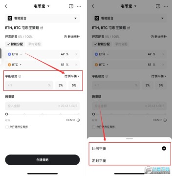 3、这里以太坊我们就可以设置为60%,比特币设置成40%。这里有两种平衡模式,一种是比例平衡,也就是说各个币种的比例发生变化,并超过阈值的时候,就会进行一次rebalance套利操作。另外一种是定时平衡,按照固定的时间去检测偏离程度,触发rebalance操作。