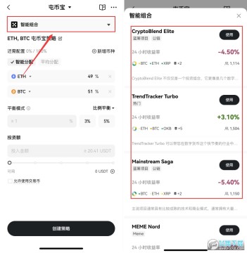 4、当然如果你不知道如何配置投资组合的话,欧易也推荐了一些智能组合,点击上方的“智能组合”,可以看到这里有很多个项目,比如说第一个和第三个是蓝筹投资组合,所选的标的都是主流加密货币,包括比特币、以太坊、索拉纳、XRP这些老牌项目,风险相对可控。第二个就是热门的趋势投资组合,会包含一些最近热炒的加密货币项目,风险很高。这里的第四个是meme币的投资组合。大家可以根据自己的投资偏好,去挑选一个投资组合。