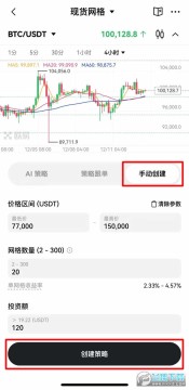 下面还有一个等差,等比网格设置参数。顾名思义等差网格就是以固定金额绝对值,来划分网格区间。比如说10万,10万五,11万,11万五,12万这个样子。而等比就是以固定百分比来递增,或者是递减网格线,低价区网格密集,高价区网格稀疏。一般来说,等差网格更适用于价格上下波动均匀的市场,而等比网格更适用于抄底。在低价区会成交买入更多次,从而在高价区锁定更好的利润。我个人感觉等差网格的理解成本更低,通用性更强一些,我这里就设置为“等差”网格。然后我们点击【创建策略】就可以创建成功了。